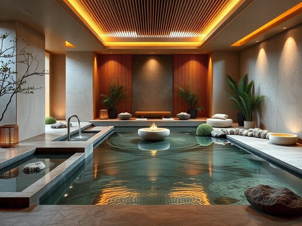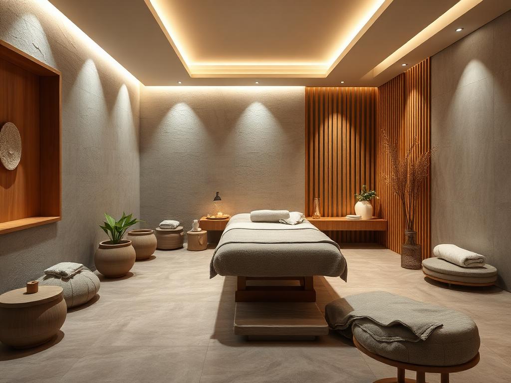 A tranquil spa environment designed to promote relaxation and rejuvenation through natural materials and calming spatial design.
